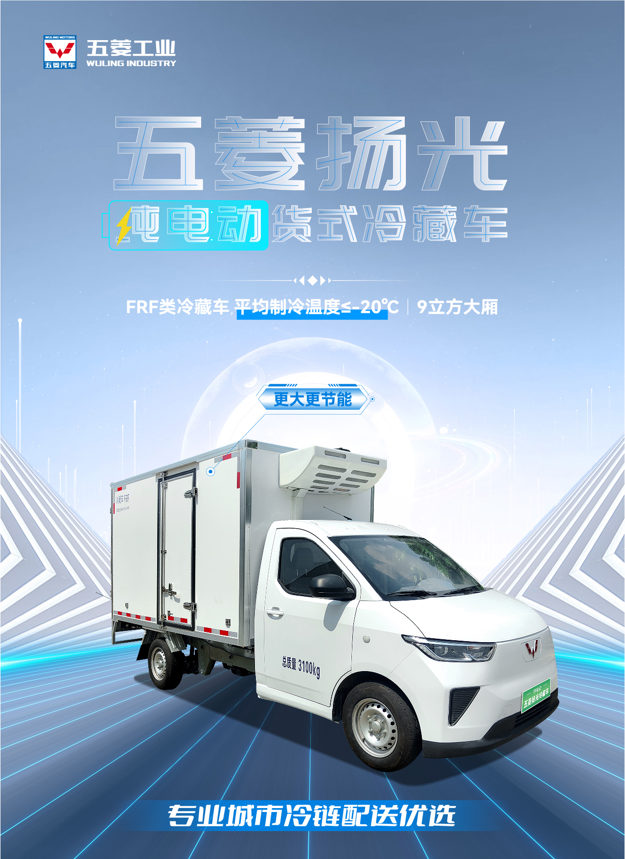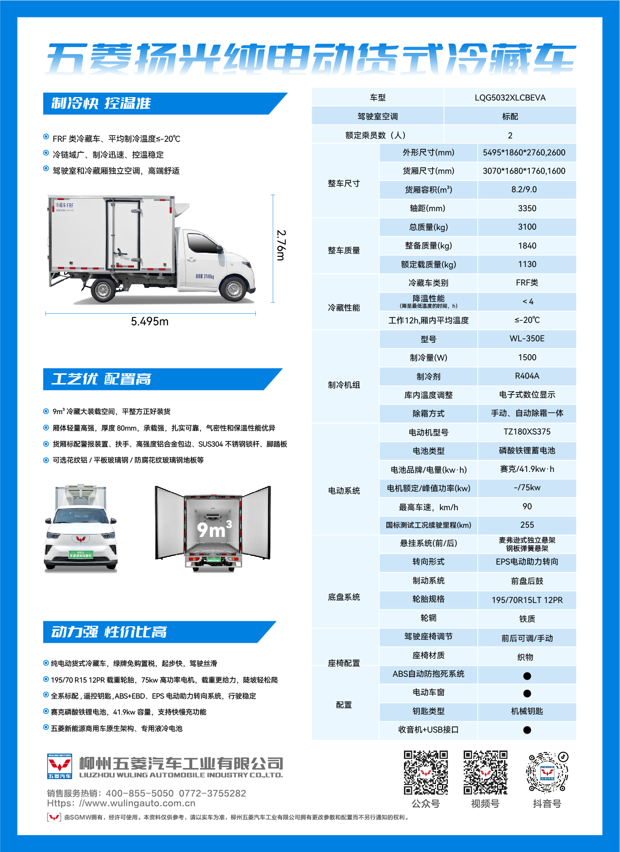 五菱扬光EV底盘,红1号电池技术,电量41.9kw·h,支持快慢充功能。 FRF类冷藏车、平均制冷温度≤-20℃。 4.8m³实用货厢空间,整车高度2.15米,出入城市地库更自由。 600mm超低尾门槛离地高度,满足叉车装卸装载需求。 195/70 R15 12P载重轮胎,75kw高功率电机,载重更给力,陡坡轻松爬。 高强度笼式车身,全系标配ABS+EBD、EPS,行驶稳定。
