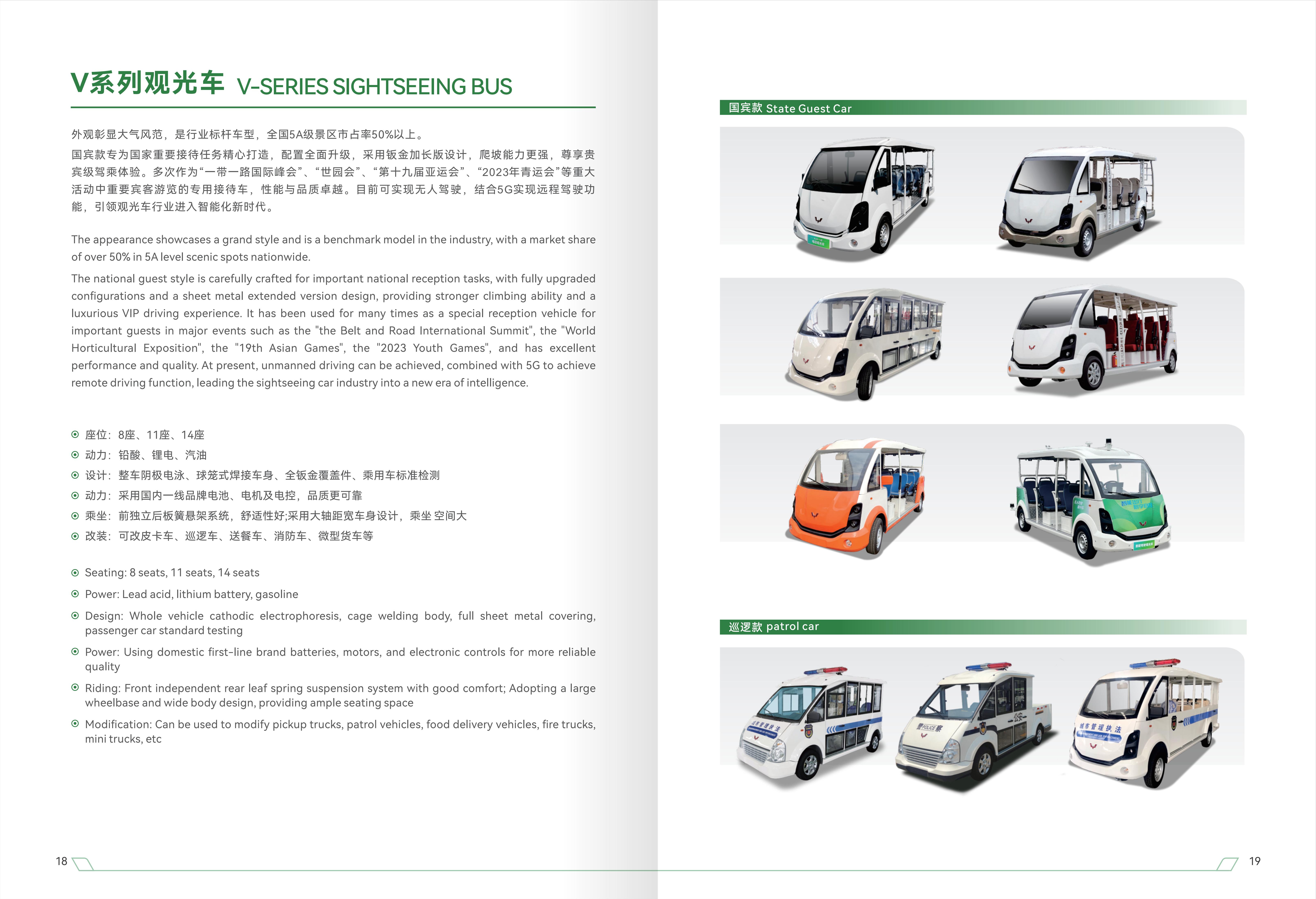 五菱V系列观光车外观彰显大气风范,是行业标杆车型,全国5A级景区市占率50%以上。