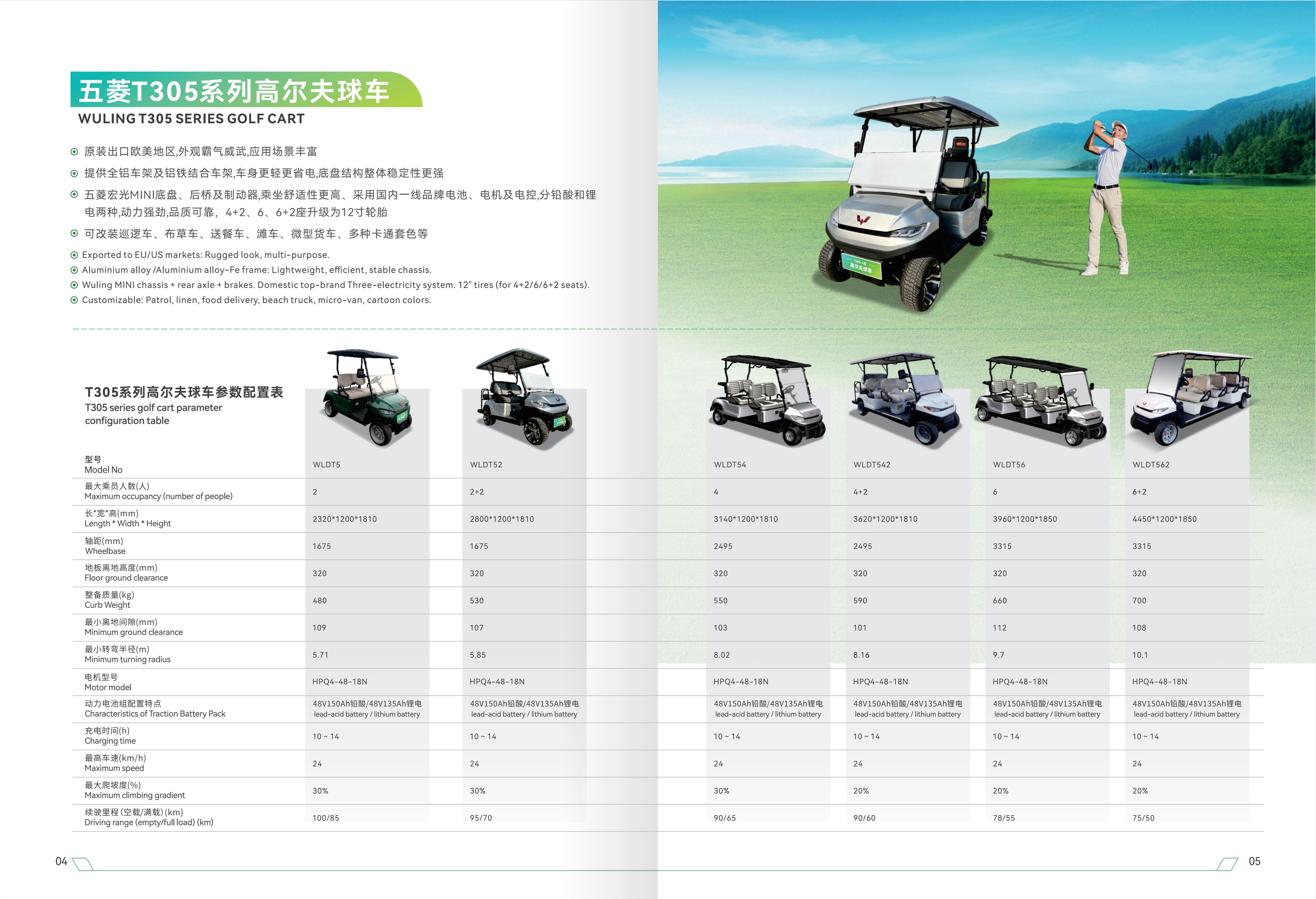 T305高尔夫球车,专为高尔夫球场、高铁站、飞机场等设计开发的环保型乘用的车辆,乘坐舒适,续航里程比同品种车辆高 10%,可在度假村、别墅区、花园式酒店、旅游景区等处使用。
